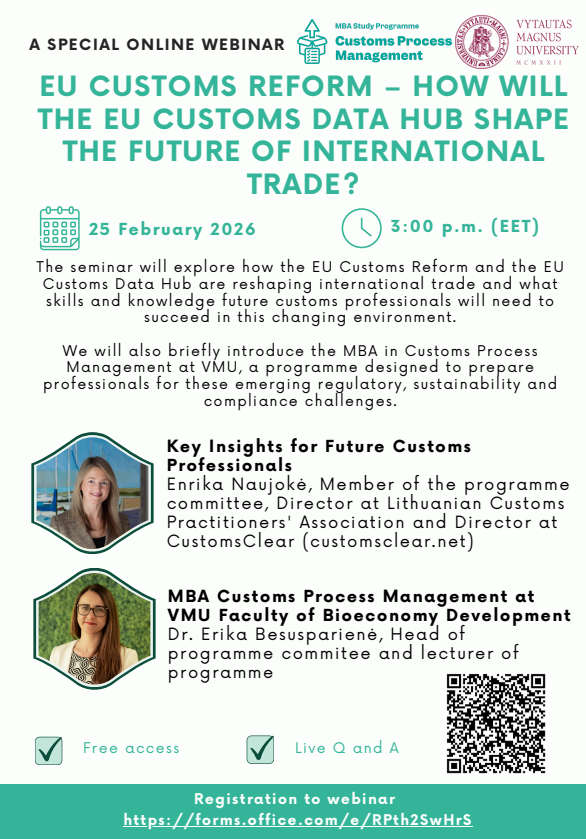 Kviečiame Jus į artėjantį internetinį seminarą „ES muitinės reforma – kur link nuves ES muitinės duomenų centras tarptautinės prekybos įmones?“. Tai aktualus renginys visiems, dirbantiems su tarptautine prekyba, muitinės procesais ar reguliaciniais pokyčiais.